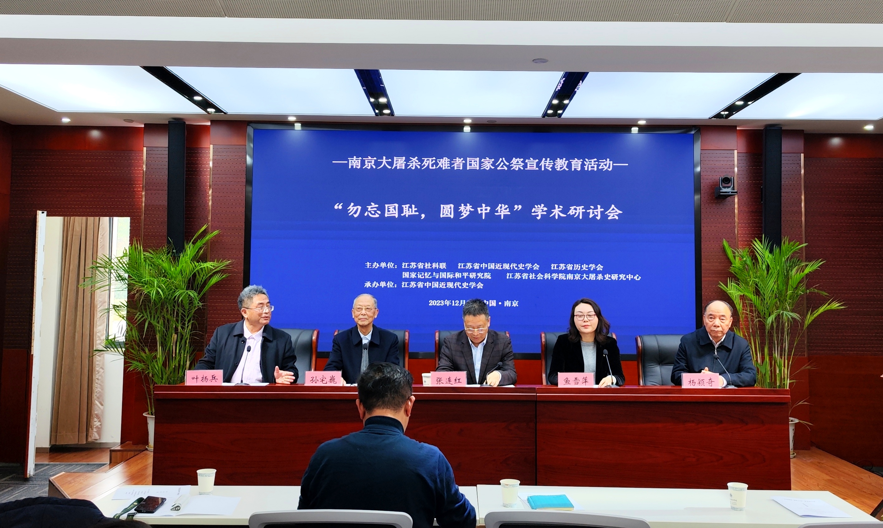 2023年12月6日下午,“勿忘国耻,圆梦中华”学术研讨会在南京举行。这次研讨会由江苏省社会科学院南京大屠杀史研究中心、江苏省社科联、江苏省中国近现代史学会、江苏省历史学会、国家记忆与国际和平研究院联合主办,江苏省中国近现代史学会承办。来自江苏省社会科学院、江苏省档案馆、侵华日军南京大屠杀遇难同胞纪念馆、南京民间抗战博物馆、中国第二历史档案馆等单位以及南京大学、南京师范大学、南京理工大学、南京医科大学、南京市图书馆、南京晓庄学院等高校的专家学者共计50余人参加此次会议。