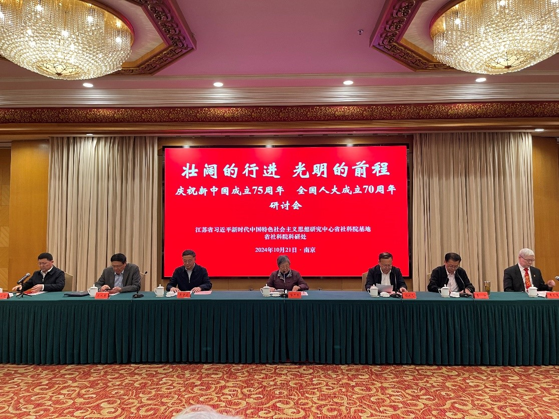 在研讨会主题发言环节,东南大学原党委书记郭广银,省人民政府参事、江苏党建研究院院长桑学成,南京大学商学院范从来,省社科院原党委委员、副院长吴先满,全国人大代表、南京外国语学校副校长李鸿彬,省人大代表、省社科院科研处处长陈朋,省社科院历史所所长叶扬兵,省社科院经济所副所长吕永刚,先后围绕“准确把握习近平新时代中国特色社会主义思想的世界观方法论”“人民代表大会制度是保证国家治理跳出治乱兴衰历史周期率的好制度”“经济强牵引‘强富美高’一体化发展是习近平省域中国式现代化的重要论述”“新中国75周年中国金融的历史性巨变与江苏金融强省建设的战略任务”“明心尽职 忠诚担当”“人民代表大会制度的角色定位及优势效能”“新中国淮河入海通道建设及其启示”“‘老三样’与‘新三样’:从生产力变迁看中国式现代化”等作专题发言。