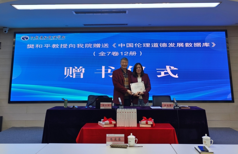 报告开始前,樊和平向我院赠送《中国伦理道德发展数据库》,共7卷12册,总字数逾1000万。该丛书是由樊和平教授带领东南大学伦理学团队完成的国家哲学社会科学重大项目成果,历时十余年打造,以2007、2013、2017、2022四轮全国大样本调查和八轮江苏跟踪调查为基础,系统呈现了改革开放以来中国伦理道德的发展轨迹、深层变革与文化共识,被誉为“国内首部长周期伦理道德国情调查的百科全书”。